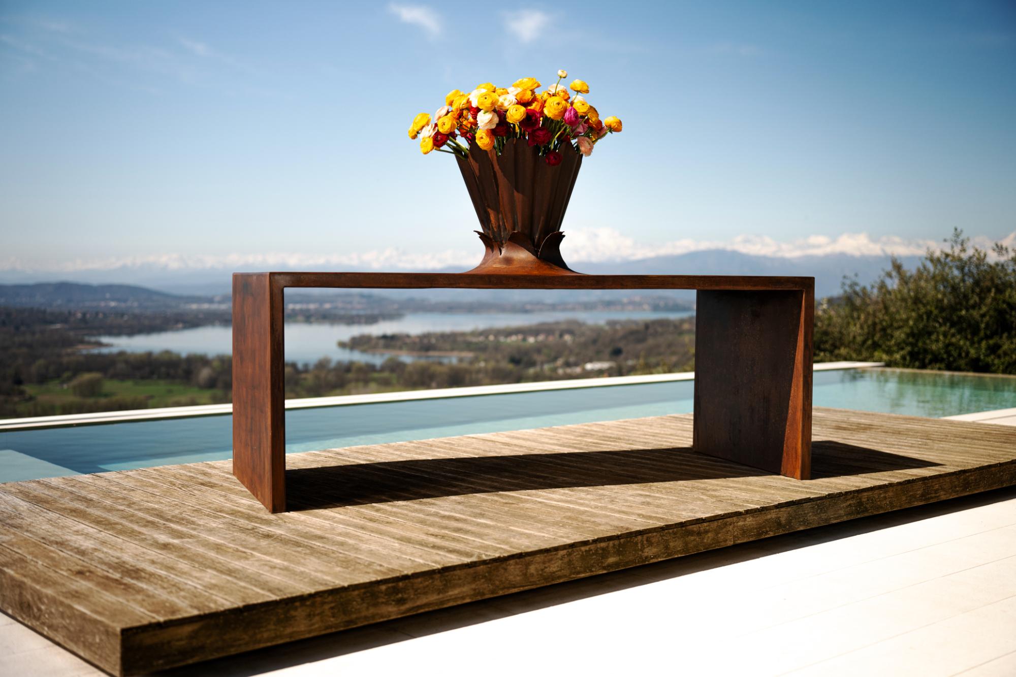 Ogni profumo cela al suo interno un’architettura invisibile, così come anche nei materiali risiede una dimensione intangibile che si manifesta solo attraverso la lavorazione del tavolo. C’è una costante ricerca di equilibrio tra questa struttura invisibile che accomuna sia le componenti del profumo sia quelle del corten, un materiale vivo, la cui superficie cambia giorno dopo giorno.